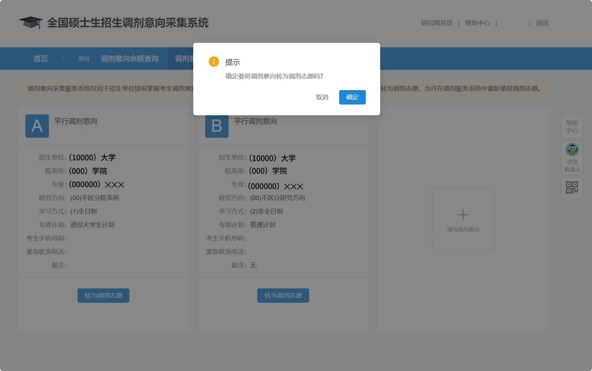 2.调剂服务系统开通后,调剂意向采集服务系统的“查询调剂意向余额信息”和“调剂意向”功能将关闭。考生可以在调剂服务系统查询调剂余额信息。