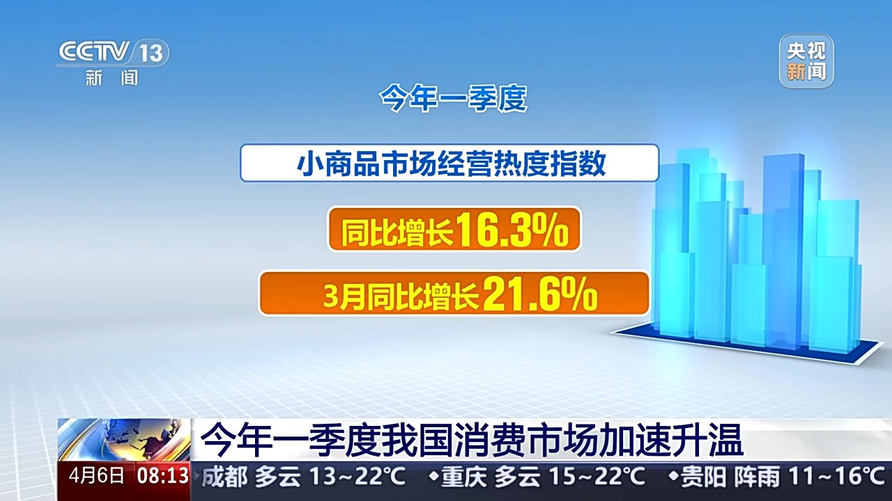 小商品市场经营热度指数一季度同比增长16.3%,其中3月同比增长21.6%,这表明与居民生活贴近的小商品销售持续保持旺盛活力,民生消费需求正在加速释放。