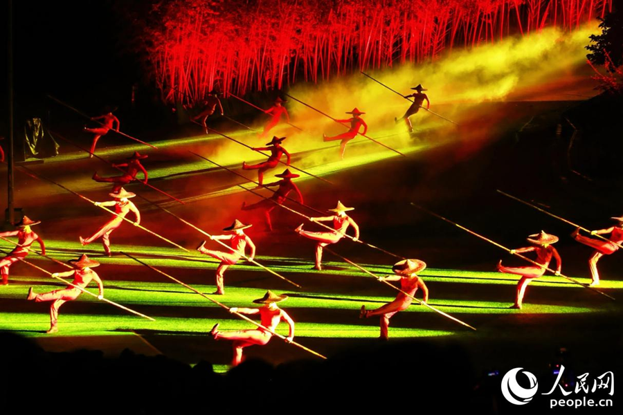 《印象大红袍》演出将传统技艺与现代舞美技术相融合,融入武夷茶农摇青的场景。人民网 李唯一摄