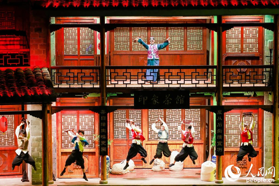 王龙涛(上)饰演茶掌柜带领茶厂的伙计,为五湖四海的茶商计算“武夷四大名枞”的价格。人民网 李唯一摄