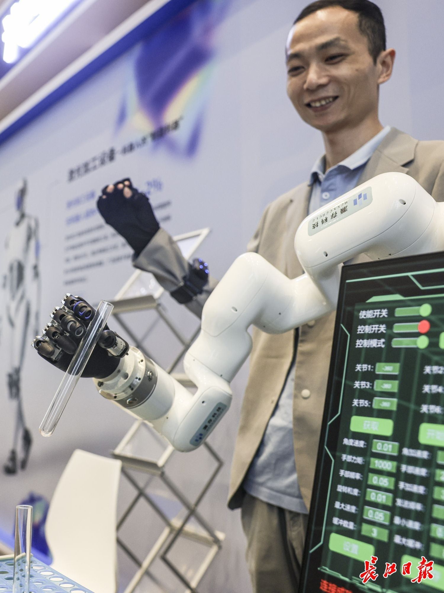 第二十届光博会“光+机器人”展位,武汉灏存科技工程师付龙演示人形机器人运动神经中枢系统,通过穿戴设备操控机械臂灵巧手完成拿起试管的精细手部动作。记者 胡冬冬 摄