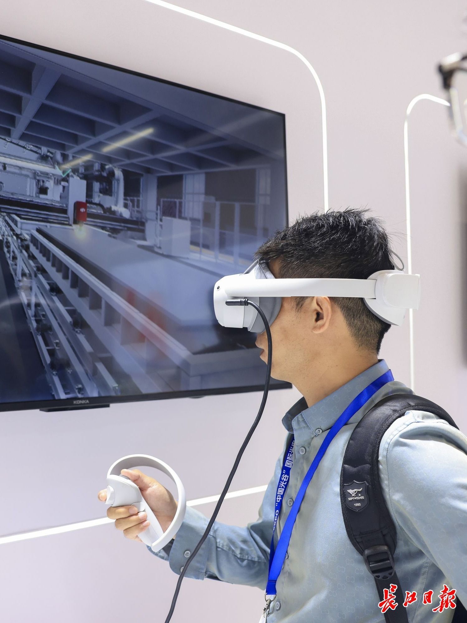 第二十届光博会华工科技展位,观众体验VR操作激光加工装备。记者 胡冬冬 摄