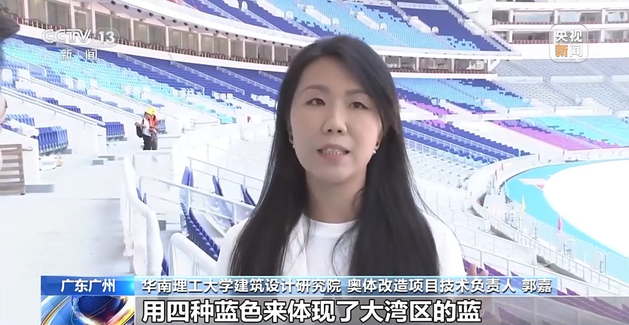 华南理工大学建筑设计研究院 奥体改造项目技术负责人 郭嘉:我们在座位的一个设计上,用四种蓝色来体现了大湾区的蓝,在这四种蓝的基础上呢,我们又加入了广东的木棉红,还有香港的紫荆紫,澳门的青莲绿色。所以把这三种颜色又融入我们四种蓝色当中去,整体体现了一种动感、活跃、开放、融合的视觉的效果。