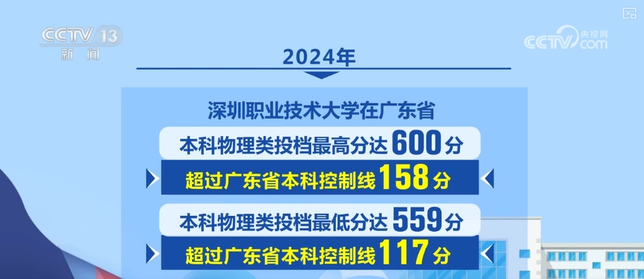 2024年,深圳职业技术大学在广东省本科物理类投档最高分达600分,超过广东省本科控制线158分;物理类投档最低分达559分,超过广东省本科控制线117分。