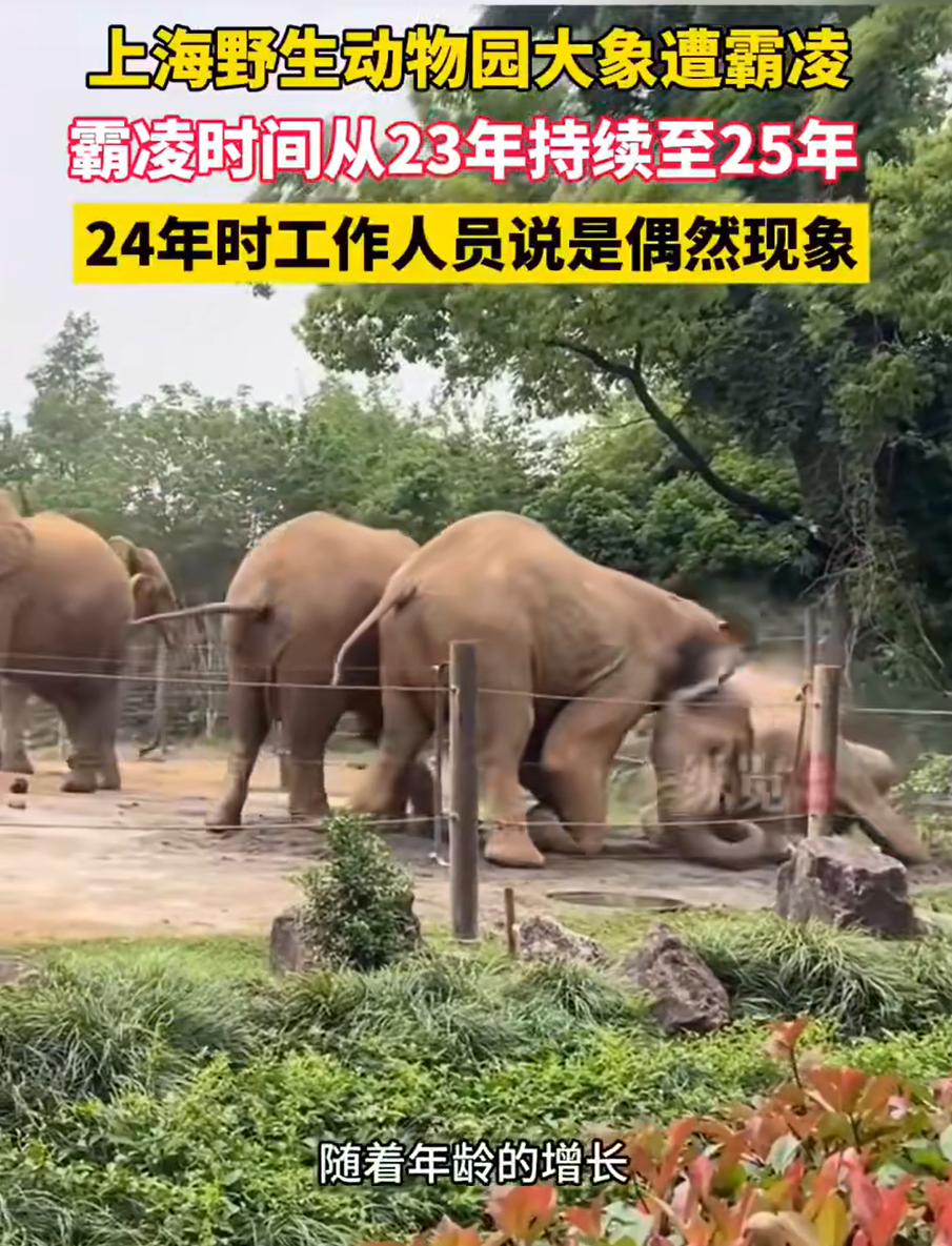近日,有网友在上海野生动物园拍到视频,疑似一大象被象群霸凌。根据网友发布的视频,有一只大象在几分钟内被其他大象反复攻击。网友表示,“被攻击的大象,身形消瘦、皮肤干瘪。”还有网友指出,“上海野生动物园大象打架事件从2022年就开始了,有时候非常激烈。”