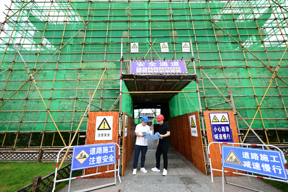 6月19日,周虎(右)在歙县徽州古城南谯楼保养维护工程现场查看。