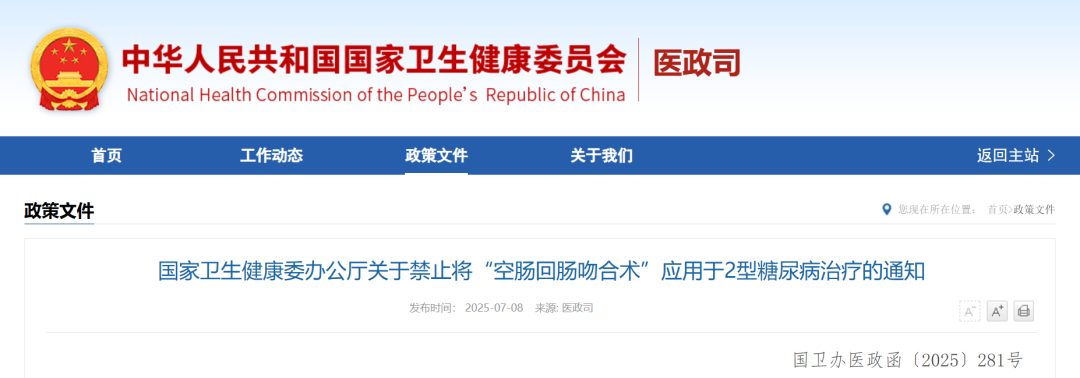 国家卫生健康委办公厅日前发布关于禁止将“空肠回肠吻合术”应用于2型糖尿病治疗的通知。通知提出,为进一步加强医疗技术临床应用管理,国家卫生健康委组织对“空肠回肠吻合术治疗2型糖尿病”进行评估,评估认为该技术缺乏基础理论支撑和高质量循证医学依据,临床应用的安全性、有效性不确切。根据《医疗技术临床应用管理办法》(国家卫生健康委员会令 第1号)有关规定,决定禁止将“空肠回肠吻合术”应用于2型糖尿病治疗。