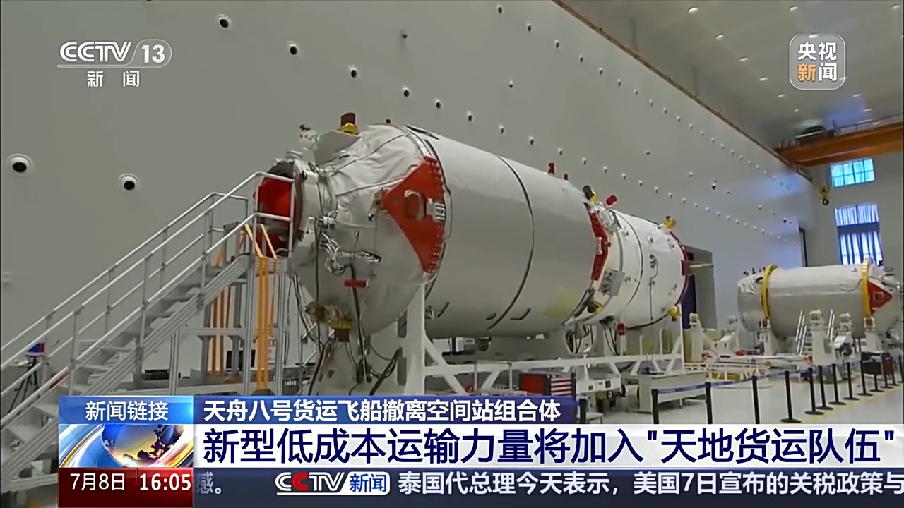 北京时间2025年7月8日15时9分,天舟八号货运飞船顺利撤离空间站组合体,转入独立飞行阶段,将于近期择机受控再入大气层。天舟八号货运飞船于2024年11月15日在文昌航天发射场发射入轨,共计在轨运行近八个月,为神舟十九号、二十号乘组提供了物资保障。通过短片,一起回顾天舟八号的任务过程。
