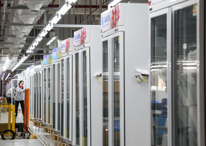 这是在西科冷链广东江门制造基地的产线上,工人对一批出口海外的商用冷柜进行外观检查(2025年3月22日摄)。新华社记者 刘大伟 摄