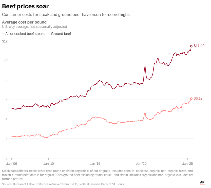 在过去的20年里,美国牛肉价格一直在稳步上涨,牛群数量几十年来则一直稳步下降。今年1月1日,美国有8670万头牛和小牛,这是自1951年以来最低的牛群数量。目前美国每年进口超过400万磅的牛肉,特朗普的关税政策可能会成为推动牛肉价格继续上涨的新因素。