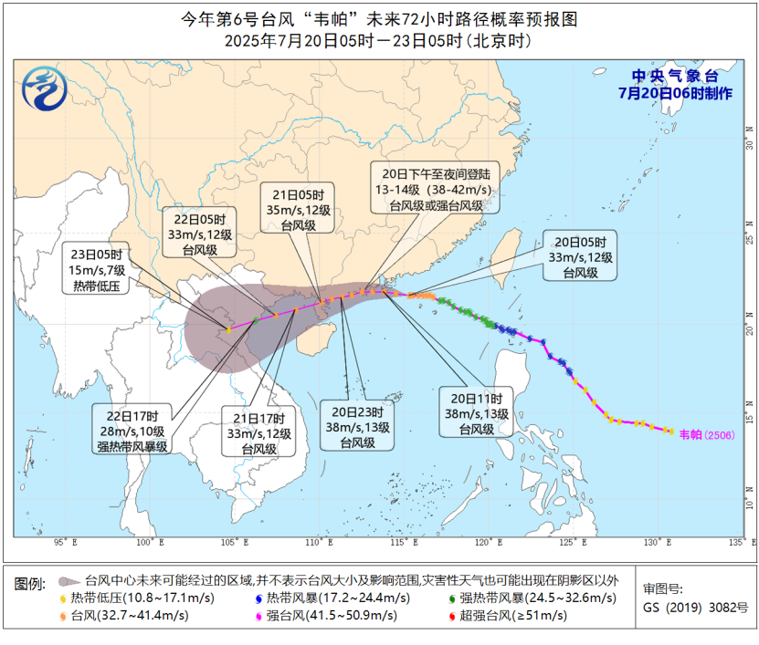 中央气象台7月20日6时继续发布台风橙色预警和暴雨橙色预警。受其影响,7月20日08时至21日08时,海南岛、广东中南部、香港、澳门、广西南部、福建东部、浙江东南部、江西西南部、湖南南部、台湾岛中南部等地有大到暴雨,其中,海南岛中北部、广东西南部、香港、澳门、广西东南部沿海等地部分地区有大暴雨,海南岛北部、广东西南部沿海等地局地有特大暴雨(250~320毫米)。上述部分地区伴有短时强降水(最大小时降雨量20~50毫米,局地90~110毫米),局地有雷暴大风等强对流天气。