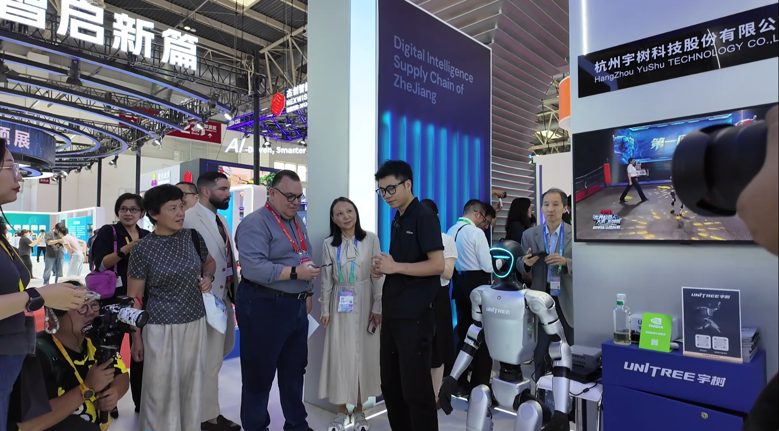 在第三届链博会上,外国观众在浙江专区向宇树科技工作人员咨询。(央广财经记者黄昂瑾 摄)