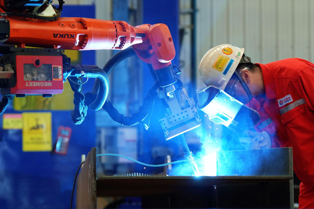 图为工作人员在海油工程天津智能制造基地查看一款机器人智能焊接系统作业。新华社记者 赵子硕 摄