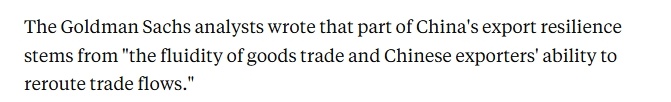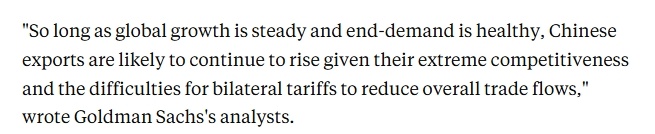 报道最后援引高盛分析师的话说,只要全球经济增长保持稳定、终端需求健康,考虑到中国出口产品极强的竞争力及双边关税难以根本扭转贸易流向,中国出口很可能持续增长。
