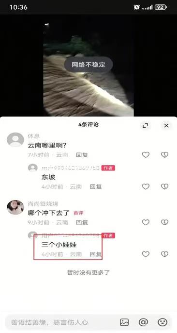 近日,楚雄网警工作发现,一网民在网络平台发布武定县公安局民警全力救援被山洪围困群众的视频。有网民在评论区询问事发地点和谁被冲走时,发布者回复“东坡”“三个小娃娃”。