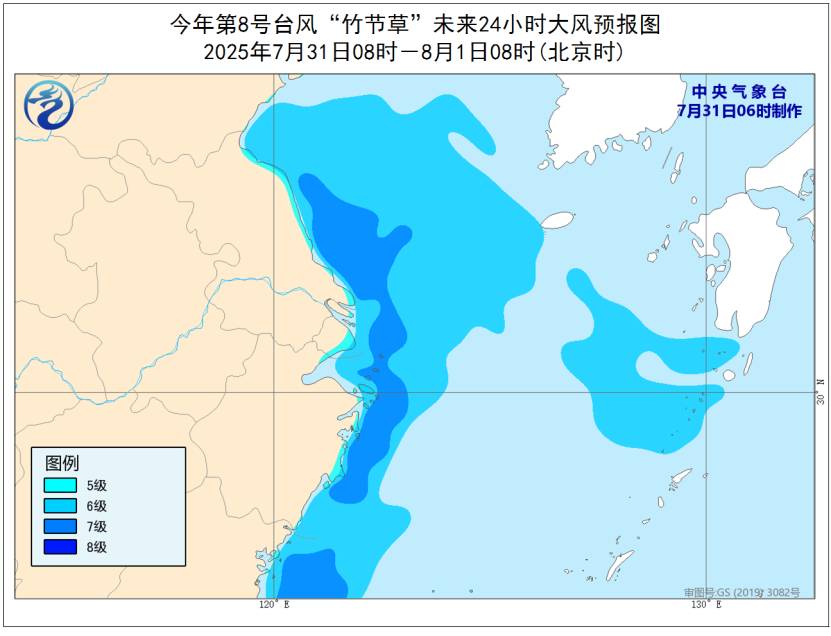 大风预报:7月31日08时至8月1日08时,黄海中南部、东海西部、江苏沿海、上海沿海、长江口区、杭州湾、浙江沿海、福建北部沿海将有6-8级、阵风9-10级风。另外,江苏东部、浙江东北部、上海等地部分地区将有5-6级、阵风7-8级风。