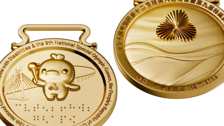 残特奥会奖牌“同心暖”也揭开面纱。奖牌顶端挂钩采用岭南特色“镬耳屋”造型,奖牌正面镌刻会徽和连绵海浪纹,背面以港珠澳大桥为背景,吉祥物中华白海豚浮雕高擎火炬,并附有盲文,让视障运动员能够亲手触摸这份荣耀。