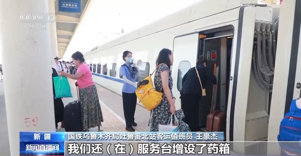 国铁乌鲁木齐局吐鲁番北站客运值班员 王豪杰:我们将检票时间从原来的15分钟调整为10分钟,以缩短旅客在高温站台的暴露时间。服务台还增配了药箱,备有防暑药品,以预防旅客在高温环境里中暑。