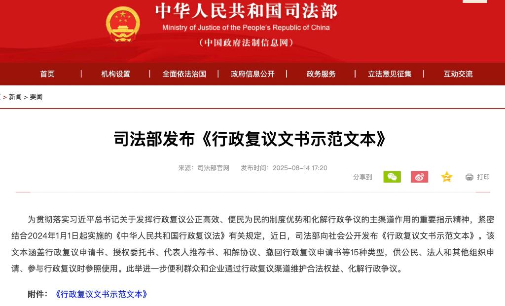 记者8月15日从司法部获悉,为发挥行政复议公正高效、便民为民的制度优势和化解行政争议的主渠道作用,司法部紧密结合2024年1月1日起实施的《中华人民共和国行政复议法》有关规定,向社会公开发布《行政复议文书示范文本》。