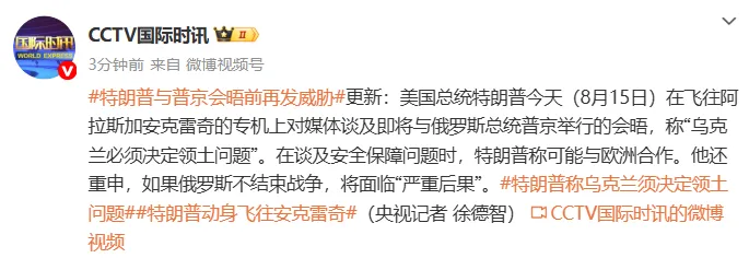 美国总统特朗普昨天(8月15日)在飞往阿拉斯加安克雷奇的专机上对媒体谈及即将与俄罗斯总统普京举行的会晤,称“乌克兰必须决定领土问题”。