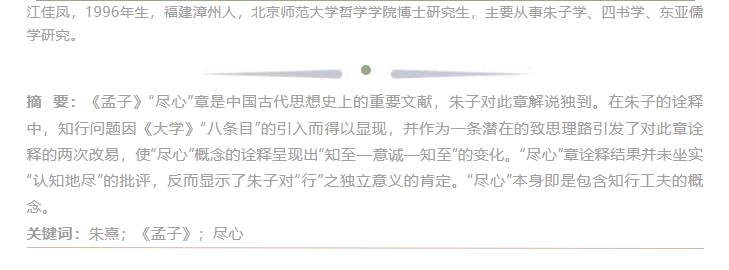 江佳凤曾在《哲学研究》《哲学与文化》等国内外高水平学术期刊发表论文6篇;参与国家社科基金项目2项;担任《国际儒藏·韩国编》审校专业委员会审校专家;先后获国家奖学金、北京师范大学“研究生学术创新奖”特等奖、二等奖,北京师范大学哲学学院优秀博士学位论文等荣誉。
