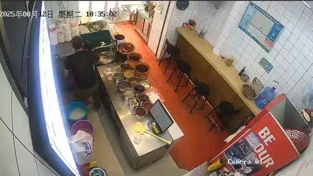 监控视频显示,事发时间为8月12日10时33分许,一名男子先进入店内,女店员端一铁盆后进入店内。男子疑让女店员先走,女店员迟疑迈步后,快步进入收银台。期间,男子试图追上女店员。