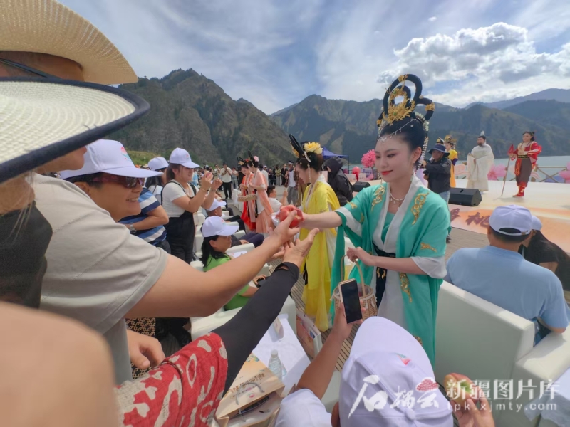 8月8日,2025中国新疆·西王母瑶池蟠桃会在天山天池景区举行,活动现场人头攒动,游客在饱览天山天池秀丽风光后纷纷驻足品尝鲜甜多汁的蟠桃。蒋浩摄