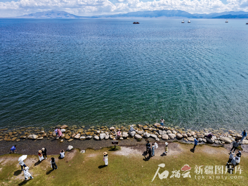 8月6日,游客在赛里木湖景区游览。(无人机摄)