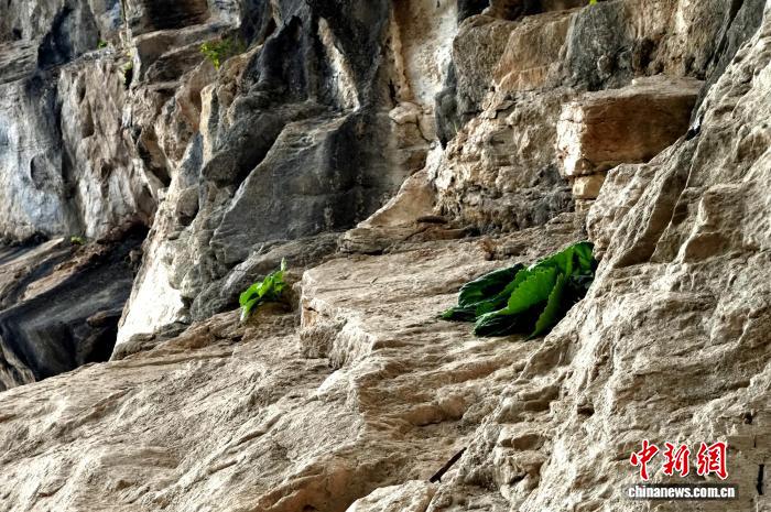 国家二级保护植物崖白菜在岩壁的石缝中生长。(无人机照片)龚世庆 摄