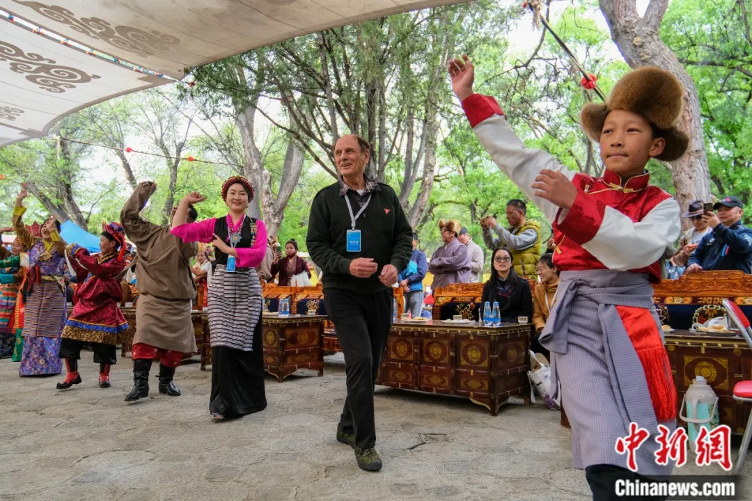 2023年5月19日,柯马凯在拉萨罗布林卡听藏戏,和当地藏族民众一道跳锅庄舞。中新社记者 江飞波 摄