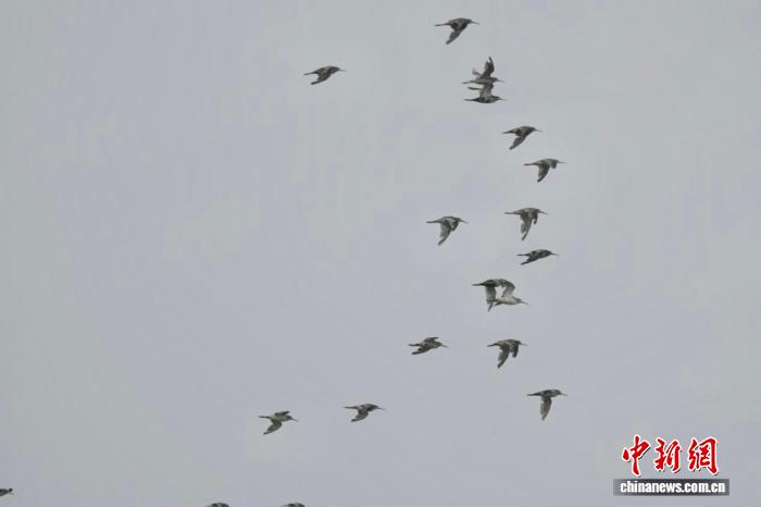 图为在江西鄱阳湖南矶湿地国家级自然保护区内飞翔的鹤鹬群。 金鑫 摄