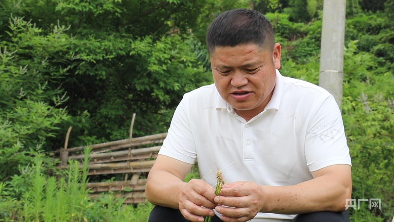 郑春模仔细观察梯田秧苗生长情况(央广网记者 王一凡 摄)