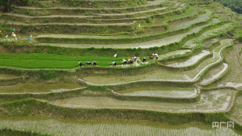 谢坪村的村民正在梯田插秧(央广网发 肖江峰 摄)