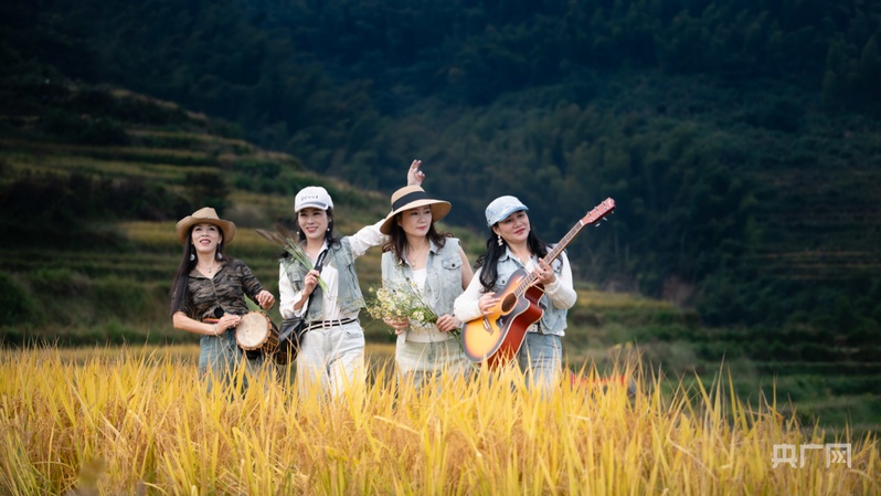 游客们手里的长枪短炮对准半山腰的梯田,咔嚓声响个不停。航拍镜头下,沉甸甸的谷穗随风摇曳。几名热爱音乐的游客在梯田中央弹起吉他,惊飞成群白鹭,雪白的翅膀掠过湛蓝晴空。
