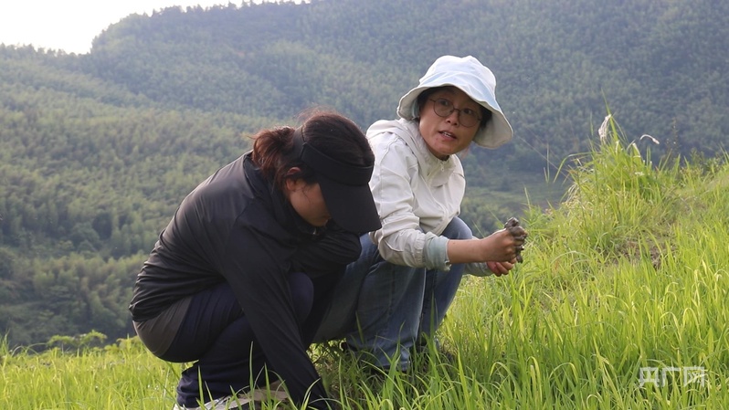周文君(右)和助手一起观察梯田土壤情况(央广网记者 郇康新 摄)