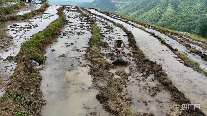 谢坪村的村民们正在梯田里打田(央广网记者 郇康新 摄)