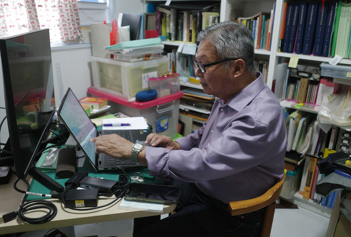 8月23日,新加坡学者林少彬在位于新加坡的家中查看资料。新华社记者 舒畅 摄