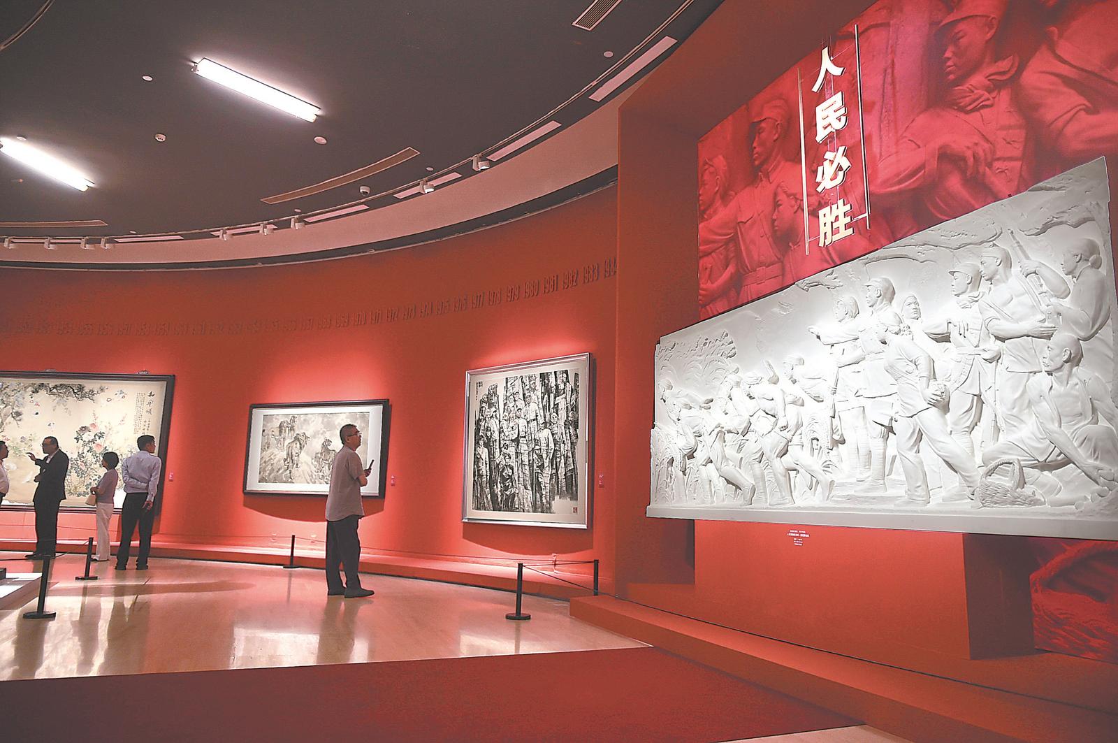 8月25日,参观者在中国美术馆观看展出作品。当日,“人民必胜——纪念中国人民抗日战争暨世界反法西斯战争胜利80周年美术作品展”在北京中国美术馆开幕。展览汇集中国美术馆、中国共产党历史展览馆、中国人民革命军事博物馆等单位收藏的300余件美术作品和新创作品,涵盖中国画、油画、版画、雕塑等多种类型,展览将持续至9月18日。