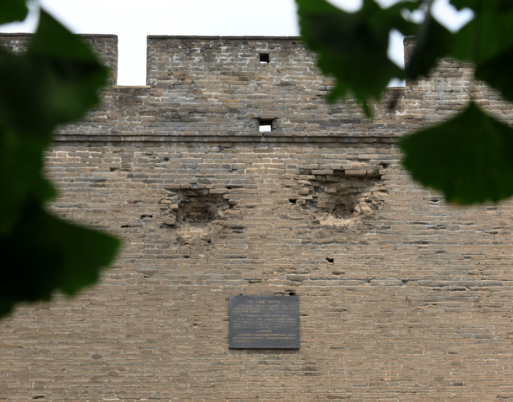 宛平城城墙上的弹坑遗迹。新华社记者 张晨霖 摄