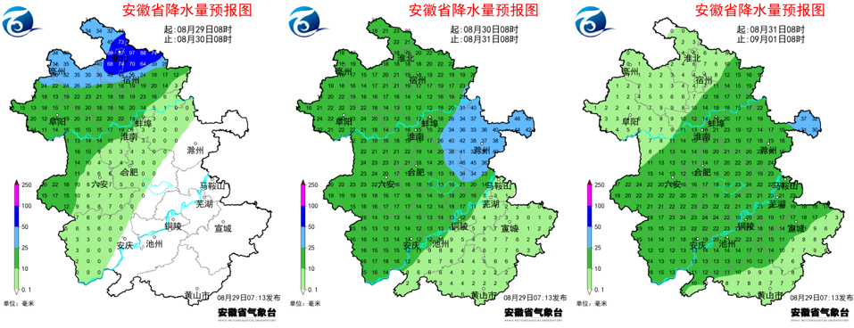 安徽省气象台预计,未来十天全省多降水过程,其中29日沿淮淮北部分地区大雨、局部暴雨,30日至31日安徽省部分地区大雨,降水期间将伴有雷暴大风(8~10级)和短时强降水(30~50毫米/小时,局部超过60毫米/小时)等强对流天气;9月1日至7日安徽省多雷阵雨天气,其中6日江北部分地区中雨。