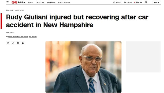 据美联社及美国有线电视新闻网(CNN)报道,当地时间8月31日,美国纽约前市长鲁迪·朱利安尼的发言人表示,朱利安尼在新罕布什尔州遭遇车祸并受伤,目前正在康复中。