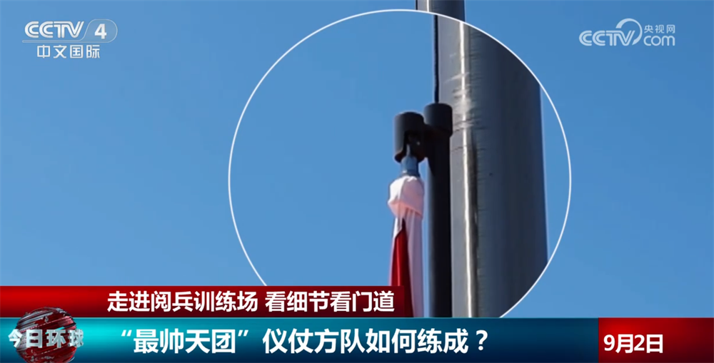 鸣响礼炮,意味着纪念活动的正式开篇。伴随礼炮声出场的国旗护卫队是唯一一支没有音乐伴奏、只能自己踩鼓点的队伍。他们要经过两次队形变换、四次步伐变换,从人民英雄纪念碑走到天安门广场旗杆下。走在最前方的升旗手需要擎着高3.81米、重达30斤的国旗杆稳步向前;挂旗杆,要分毫不差将30斤的旗杆挂入副杆顶部的卡槽里;展旗,则是要把国旗展出一个完美的扇形。