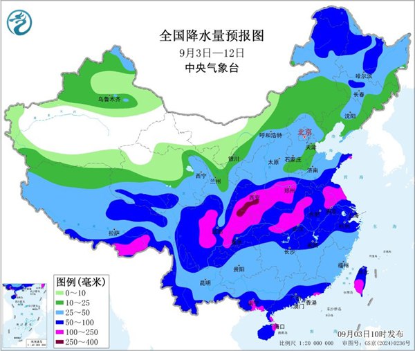 同时,据中央气象台,未来十天(9月3日至12日)陕甘川交界一带雨日多、累计雨量较大。3日至6日,西北地区东部、四川盆地、华北南部、东北地区南部及黄淮等地自西向东有一次中到大雨过程,陕西南部、甘肃南部、山西南部及四川北部等地局部有暴雨。8至9日及10至12日,主雨区在陕西南部、四川东部、江汉、江淮及江南北部,上述地区有中到大雨,部分地区暴雨。