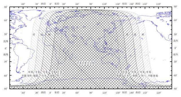 (月全食可见范围。图源:中国科学院紫金山天文台)