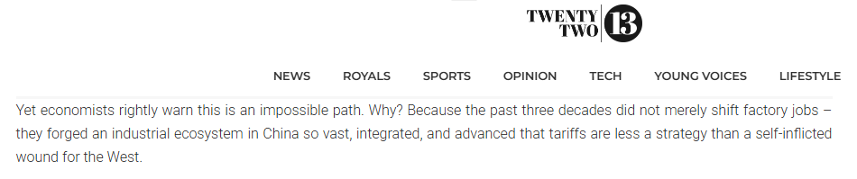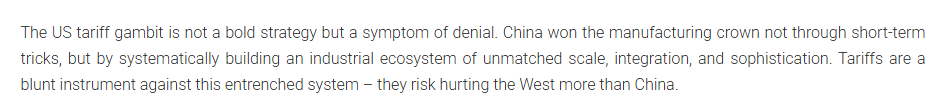 文章指出,美国的关税策略不是一项大胆的战略,而是否认现实的症状。中国赢得制造业桂冠不是通过短期手段,而是通过系统地建立一个规模、一体化和复杂程度无与伦比的工业生态系统。