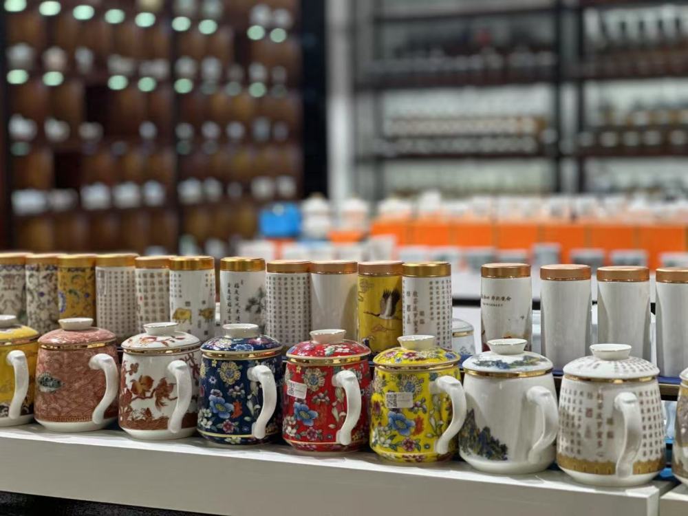 如今,茶具城有600多家店铺,茶盏、茶杯、茶漏……各类陶瓷茶具应有尽有。许多商家还将商铺内外分隔,外间用来展示产品、接待顾客,里间则进行直播带货、线上销售。