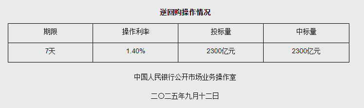 中新网9月12日电 据央行网站消息,2025年9月12日中国人民银行以固定利率、数量招标方式开展了2300亿元逆回购操作。具体情况如下: