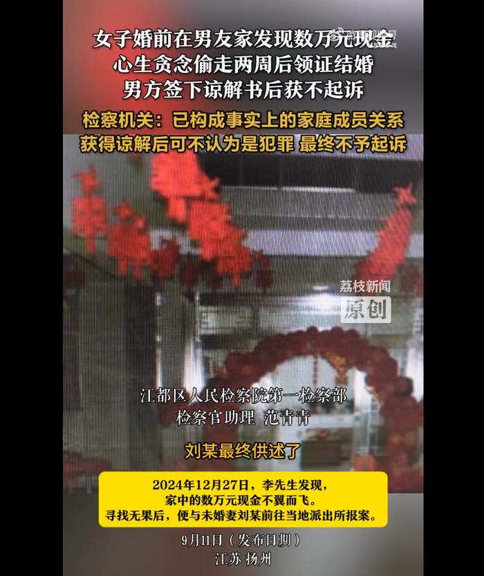 检察官称,盗窃发生后两周,二人就领证结婚,形成了事实上的家庭成员关系。根据司法解释,发生在家庭成员之间的盗窃,获得谅解的一般可以不认为是犯罪。