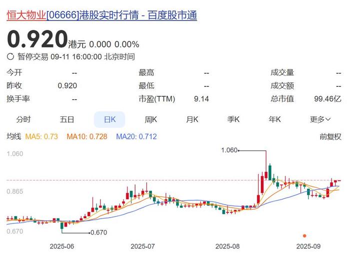 9月11日上午,恒大物业宣布停牌。停牌前,恒大物业股价不足1港元,总市值99.46亿港元(约合人民币91亿元)。