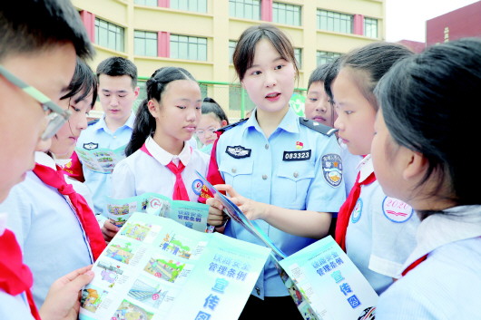 图为六安站派出所民警在向裕安区城南镇中心小学学生宣传《铁路安全管理条例》等相关法律法规。 记者 田凯平 摄